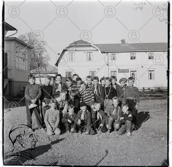 gruppfoto, barn, utomhus, byggnad, svartvitt, skola, pojkar, uniformer, scout, gårdsplan, gammaldags, 1900-tal, soligt, träd, fönster, tak, skugga, leende, samling, aktivitet, fritid