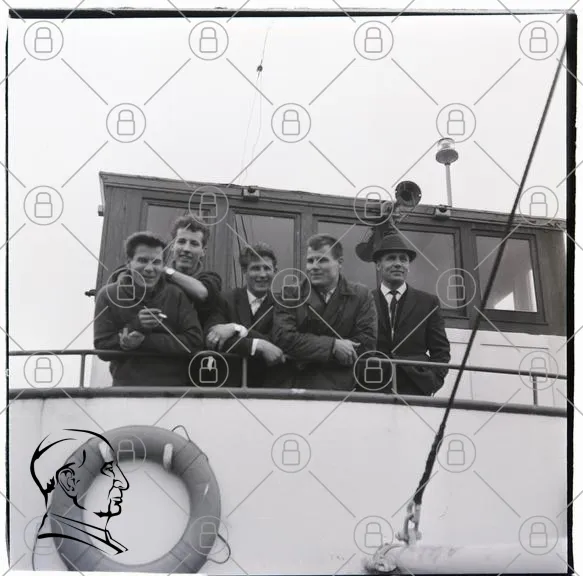 båt, män, grupp, svartvitt, sjö, livboj, kläder, 1950-tal, leende, vänner, fotografi, hamn, båtdecks, stil, tradition, nostalgi, samhörighet, resor, hav, marin
