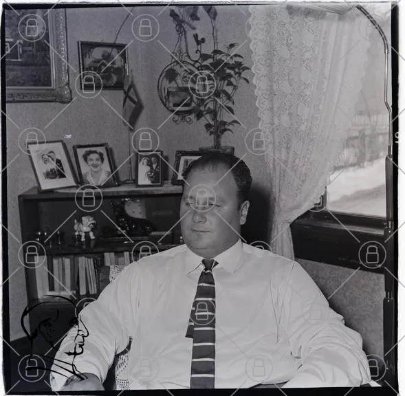 man, kontor, svartvitt, fotografi, inredning, möbler, fönster, växt, tavlor, bokhylla, slips, skjorta, leende, porträtt, 1900-tal, hem, familjefoton, stil, retro, klassisk, sittande, avslappnad, interiör, heminredning, traditionell, personlig, nostalgi, vintage, hemkänsla, vardagsrum