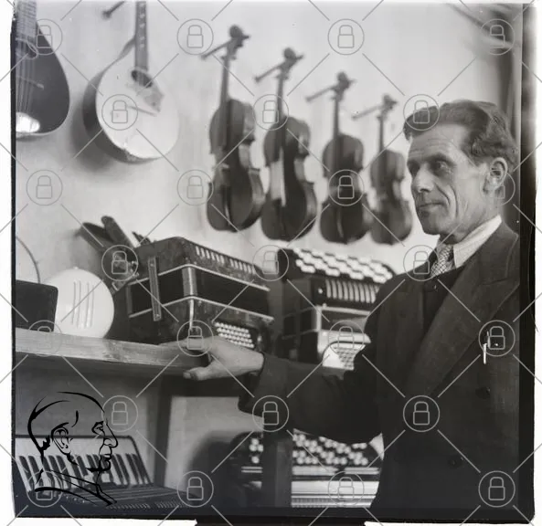 musikinstrument, fiol, gitarr, piano, ackordeon, man, vintage, musikaffär, instrumenthylla, svartvitt, retro, musiker, hantverk, kultur, tradition, musikaliskt, samling, handgjorda, ljud, melodier