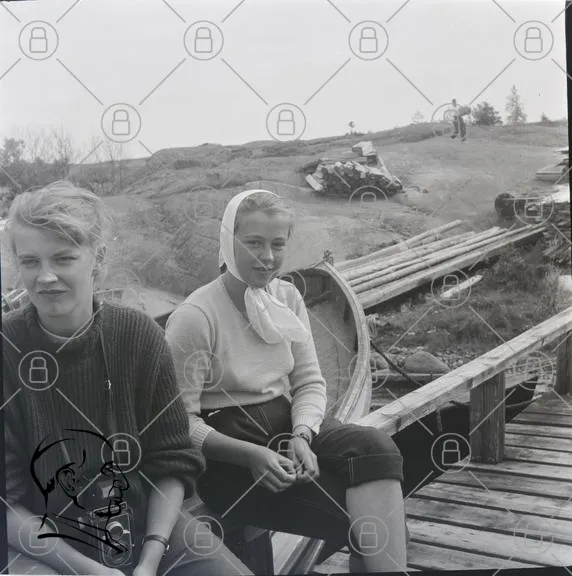 flickor, fotografi, svartvitt, båt, brygga, kläder, 1900-tal, natur, landskap, sommar, kamera, skärgård, vänskap, ungdomar, traditionell, huvudduk, trä, sten, vatten, fritid, leende, nostalgi, utomhus, aktivitet, kultur, historia, svensk