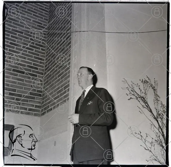 man, kostym, slips, vägg, tegelvägg, inomhus, tal, stående, växt, svartvit, fotografi, 1900-tal, formell, arkitektur, skugga