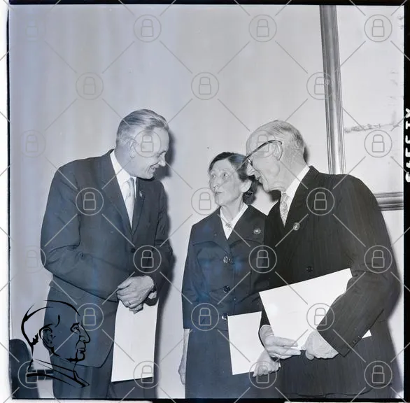 möte, diskussion, tre personer, svartvitt, kostymer, papper, inomhus, 1960-tal, formell, porträtt, ansikten, kläder, dokument, interaktion, professionell, äldre, man, kvinna, samtal, bakgrund, vägg, fotografi, historisk, uttryck, kroppsspråk, samarbete, socialt, grupp, affärsmöte, presentation