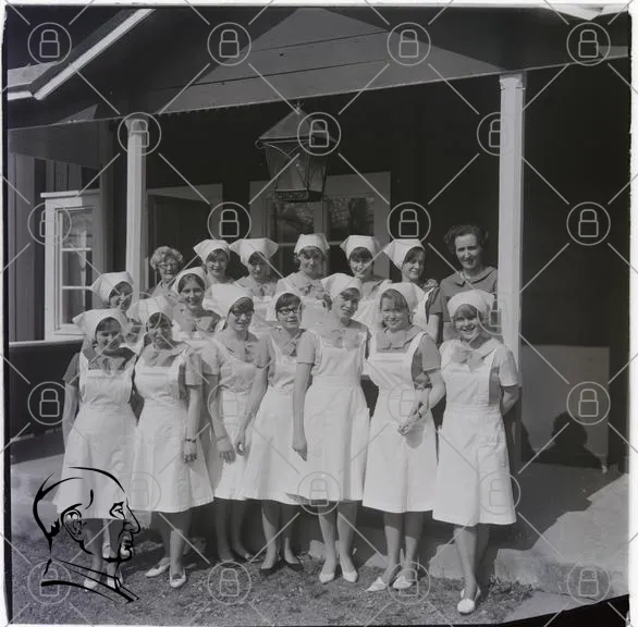 sjuksköterskor, grupp, svartvitt, kläder, uniformer, leende, byggnad, utomhus, 1960-tal, traditionell, vård, kvinnor, fotografering, gemenskap, historia, lampor, fönster, hattar, skola, utbildning, professionell, samarbete, vårdpersonal, stil, mode, nostalgi, porträtt, samling, glädje, vänskap
