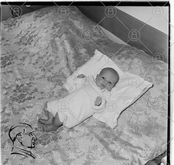 bebis, säng, kudde, blommönster, vit, filt, barn, sovande, inomhus, baby, nyfödd, mjuk, sängkläder, liggande, ansikte, ögon, kläder, sött, familj, kärlek, trygghet, hem, barnrum, fotografi, svartvitt, nostalgi