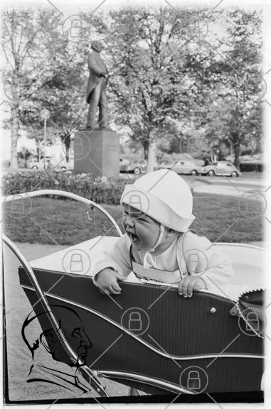 barn, barnvagn, leende, staty, park, träd, svartvitt, 1950-tal, glädje, utomhus, familj, lek, historisk, monument, gata, fordon, kläder, huvudbonad, skratt, barndom, nostalgi, natur, sommar, soligt, barnskrik, lekplats, minnen, tradition, kultur, samhälle