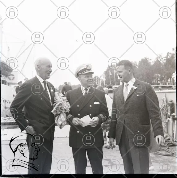 män, barn, sjöman, uniform, hamn, samtal, 1950-tal, svartvitt, kläder, leende, vuxna, båt, fotografi, historiskt, socialt, möte, vänner, familj, tradition, stil, maritimt, kust, hav, resande, gemenskap, nostalgi, tidsepok, mänskliga relationer, barnvagn, vuxenliv