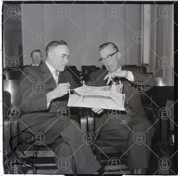 möte, män, diskussion, modell, nät, stolar, 1900-tal, svartvitt, presentation, affärsmän, kontor, glasögon, kostymer, prototyp, teknik, planering, idéer, kreativitet, samarbete, historisk