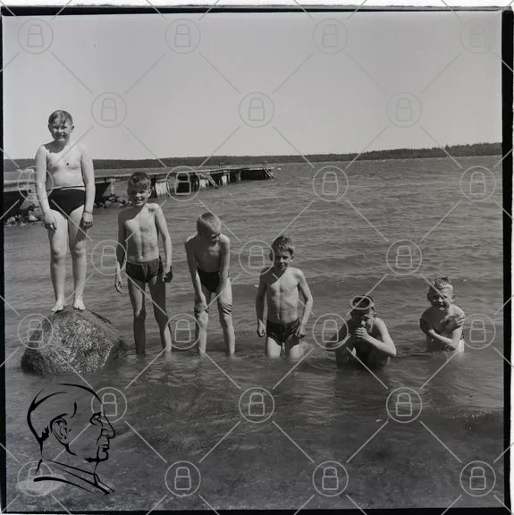barn, badar, sjö, sommar, vatten, brygga, sten, simning, svartvitt, utomhus, lek, glädje, grupp, pojkar, strand, natur, sol, fritid, barndom, skratt