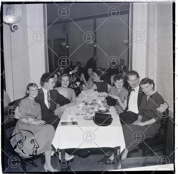fest, middag, sällskap, kläder, 1950-tal, svartvitt, leenden, bord, stolar, kvinnor, män, socialt, restaurang, glas, mat, dryck, eleganta, samvaro, retro, nostalgisk, glädje, interiör, belysning, skratt, vänskap, stil, tradition, firande, minnen, gemenskap