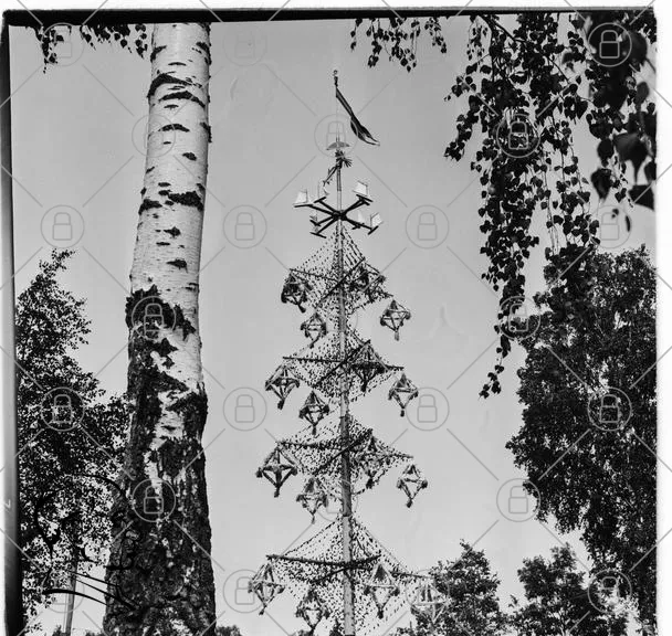 julgran, dekorationer, flagga, björk, träd, vinter, tradition, fest, ljus, gran, snö, natur, utomhus, högtid, svensk, kultur, jul, pynt, granris, stjärna, granformad, grön, svartvitt, gammal, fotografi, landskap, festligheter, gemenskap, firande, julpynt