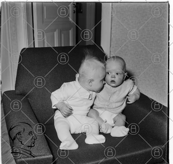 två, bebisar, soffa, svartvitt, inomhus, leende, kläder, barn, ansikten, sittande, fotografi, 1900-tal, familj, söta, barnkläder, interiör, nostalgi, barnvakt, syskon, tidigt, retro, heminredning, barnrum, lek, skratt, minnen, kärlek, oskuld, barndom