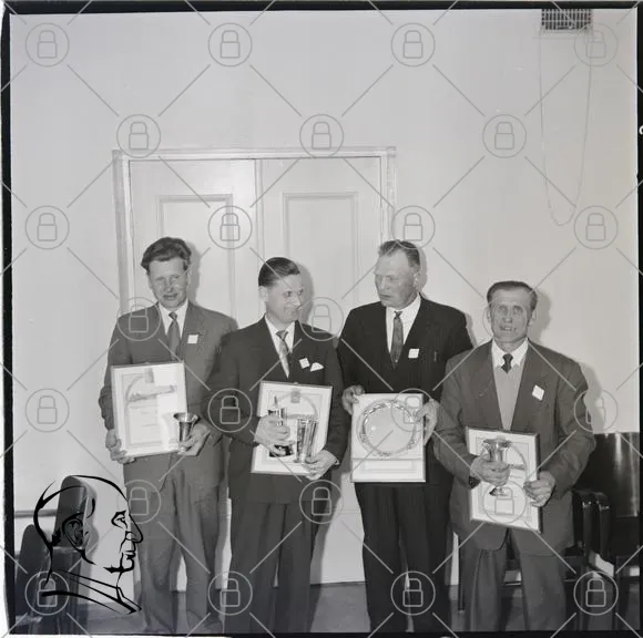 priser, utmärkelser, män, troféer, ceremonin, svartvitt, 1950-tal, kläder, dokument, leenden, presentation, grupper, kontor, medaljer, tradition, festligheter, prestationer, historia, samling, evenemang