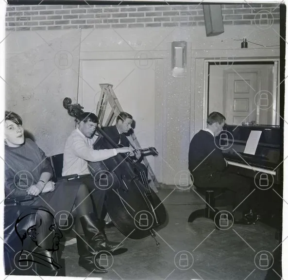 musik, konsert, piano, cello, musiker, repetition, svartvitt, 1960-tal, klassisk musik, instrument, sittande, övning, lokal, kultur, samspel, notblad, kreativitet, ljud, ensemble, artist, scen, publik, kläder, inomhus, tradition, komposition, harmonik, melodisk, uttryck, samarbete