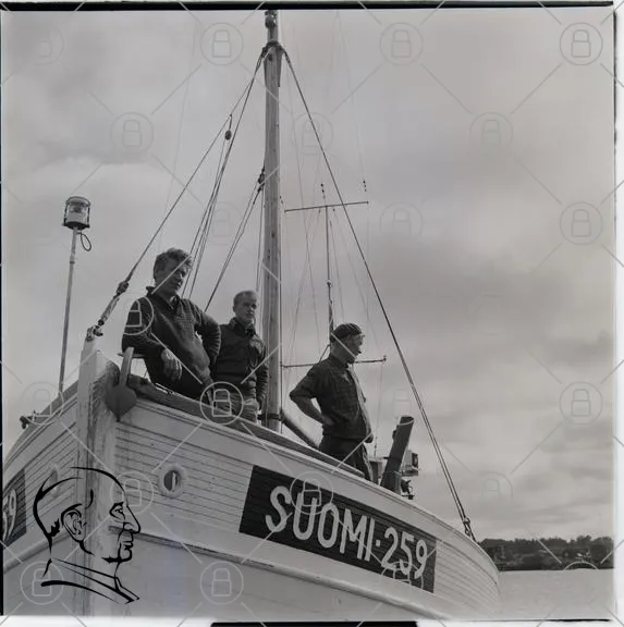 båt, män, SUOMI-259, segel, hav, svartvitt, fiske, marin, vatten, himmel, kläder, trä, traditionell, besättning, skärgård, landskap, nostalgi, historia, sjöfart, transport, natur, utomhus, sommar, aktivitet, arbete, samarbete, kultur, foto, vintage