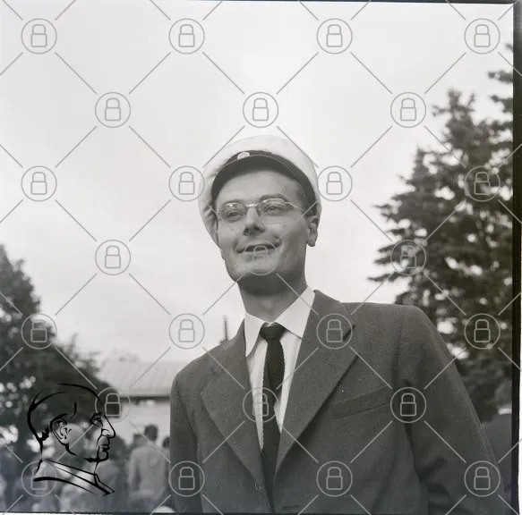 man, kostym, hatt, glasögon, leende, svartvitt, utomhus, träd, publik, 1900-tal, fest, stil, kläder, ansikte, porträtt, traditionell, evenemang, ungdom, nostalgisk, mode, bakgrund, natur, social, samling, historisk, fotografi, uttryck, manlig, stilren, klädd