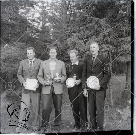 tävling, priser, troféer, män, skog, 1940-tal, kläder, svartvitt, sport, prestation, glädje, tradition, gemenskap, utmärkelse, fotografering, minne, natur, stil, historia, vänner, firande, framgång, laganda, nostalgi, utomhus, samling, prestationer, hedersbetygelse, sportevenemang, jubel