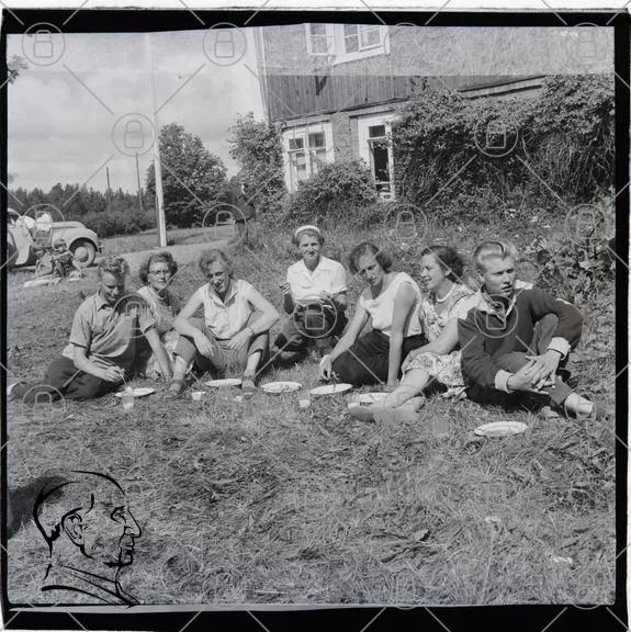 grupp, människor, utomhus, picknick, mat, 1940-tal, svartvitt, landskap, sommar, kläder, traditionell, samling, glädje, natur, fotografering, avslappnad, gemenskap, historia, familj, vänner