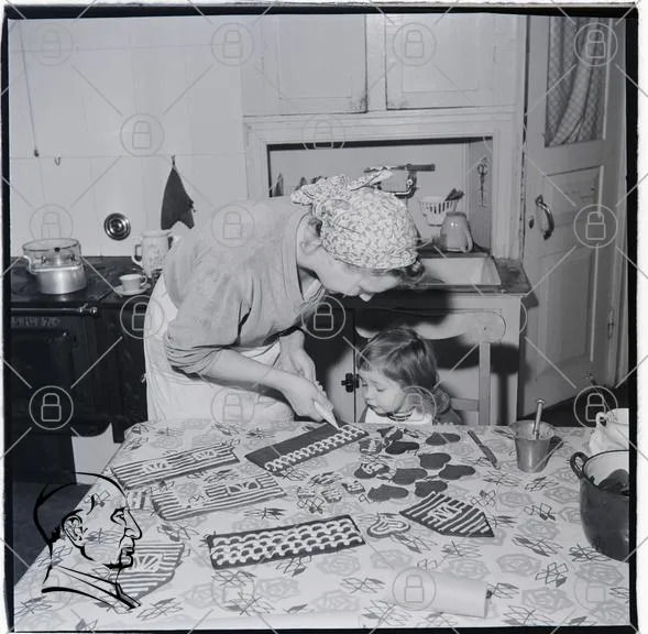 kvinna, barn, kök, bakning, kakor, mönster, bord, retro, svartvitt, familj, samarbete, matlagning, tradition, hemlagat, kreativitet, dekoration, mjöl, socker, glasyr, redskap, plåt, skålar, skratt, gemenskap, tidlös, nostalgi, hantverk, kultur, hem