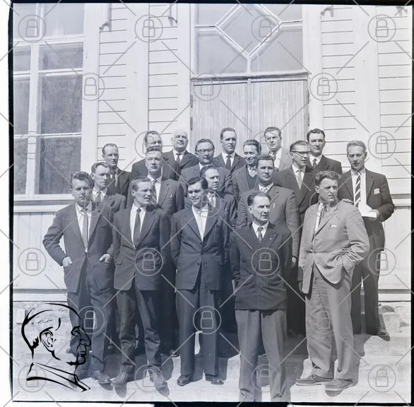 grupp, män, svartvitt, fotografi, byggnad, fönster, kläder, kostymer, stående, porträtt, 1900-tal, stil, tradition, samling, utomhus, trappa, ledare, möte, historia, gammal, formell, ansikten, gemenskap, social, professionell, tidsepok, kultur, representation, organisation, samarbete, minne
