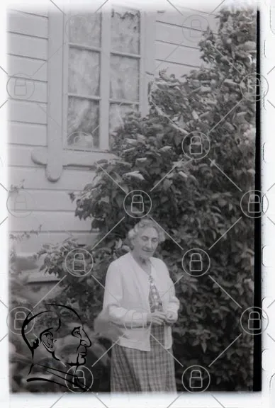 gammal kvinna, trädgård, buskar, hus, svartvitt, klänning, vit kofta, fönster, natur, porträtt, vintage, utomhus, sommar, växter, traditionell, ansikte, leende, gammaldags, familj, minnen