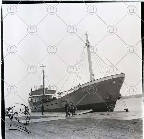 fartyg, hamn, lastfartyg, människor, kaj, svartvitt, båtar, last, sjöfart, vinter, transport, industri, vatten, landskap, byggnader, segel, mast, lastning, avlastning, historia