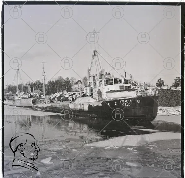 båt, Gracia, Oslo, is, vinter, hamn, sjöfart, fartyg, landskap, svartvit, vatten, träd, isflak, transport, skepp, marina, kusten, sjö, last, industri, navigering, hav, sjövägar, historia, fotokonst, retro, gammal, skandinavien, natur, miljö