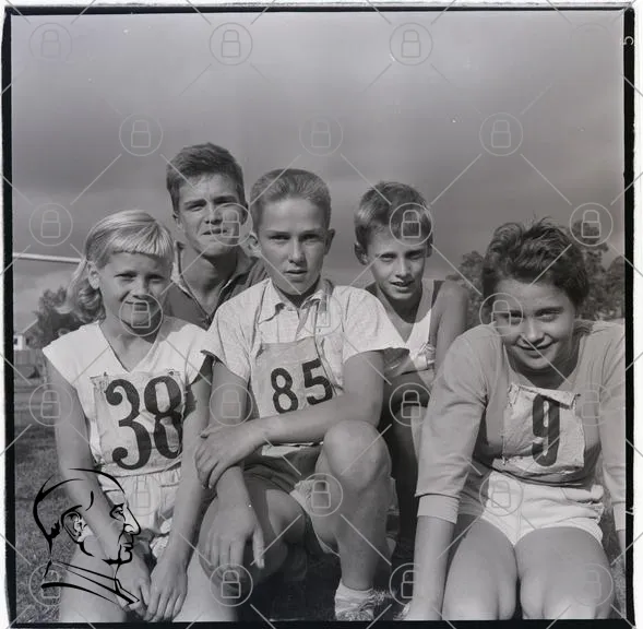 barn, idrott, nummerlappar, gruppfoto, svartvitt, sport, ungdomar, leenden, tävling, sommar, gräs, pojkar, flickor, 1950-tal, gemenskap, aktivitet, utomhus, kläder, nummer 38, nummer 85, nummer 9