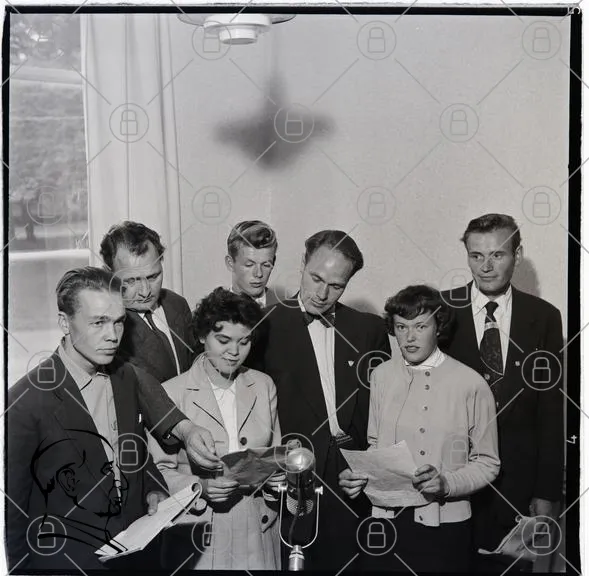 grupp, människor, mikrofon, dokument, svartvitt, 1950-tal, kläder, stående, inomhus, samarbete, ungdomar, presentation, tal, fokus, ansikten, ljus, skugga, interaktion, tradition, historia, evenemang, socialt, kommunikation, uttryck, samling, artister, skådespelare, scen, kultur, gemenskap