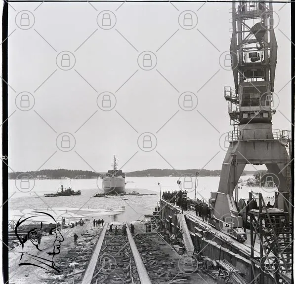 fartyg, hamn, is, byggarbetsplats, människor, kran, vatten, vinter, skepp, tuggarbåt, trä, kaj, industri, transport, sjöfart, landskap, konstruktion, hav, lastning, avlastning, marin, anläggning, arbete, teknik, säkerhet, maskiner, sjö, isbrytare, fartygsbygge, historisk, svartvit