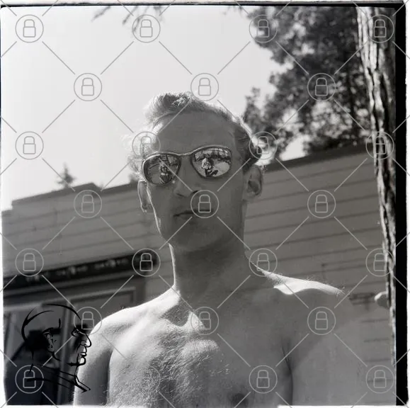 man, solglasögon, bar överkropp, utomhus, sommar, träd, byggnad, svartvitt, fotografi, avslappnad, stil, 1900-tal, vintage, natur, fritid