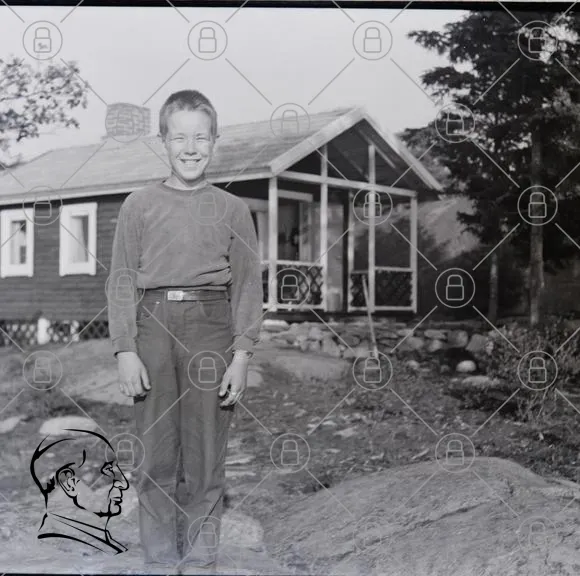 pojke, leende, hus, stuga, natur, träd, gräs, sten, svartvitt, fotografering, utomhus, landskap, sommar, barn, traditionell, enkel, byggnad, familj, minnen, nostalgi