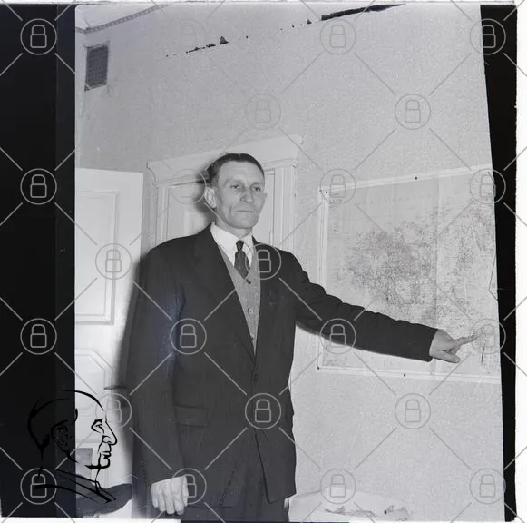 man, kostym, karta, pekar, rum, svartvitt, 1900-tal, inomhus, kontor, kläder, formell, historisk, vägg, dokument, fotografi, gammal, stil, ansiktsuttryck, gest, presentation, information, geografi, detaljer, miljö, interiör, professionell, affärsmann, traditionell, klädsel, manlig