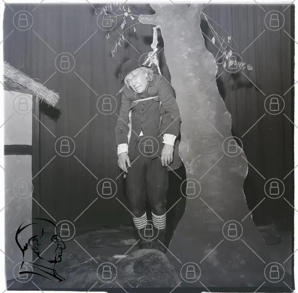 man, hängande, träd, kostym, svartvitt, teater, scen, gammal, kläder, skådespelare, rekvisita, dramatik, humor, absurd, vintage, 1900-tal, komedi, föreställning, karaktär, uttryck, surrealism, konst, teaterkonst, scenografi, publik, underhållning, tradition, kultur, berättelse