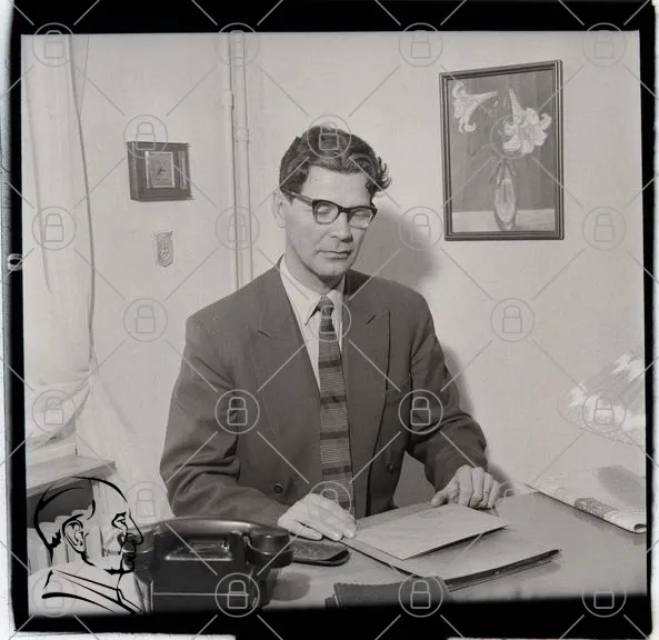 man, kontor, glasögon, skrivbord, telefon, dokument, svartvitt, inredning, konst, vägg, kläder, 1950-tal, professionell, fokus, stilla, interiör, blommor, tavla, papper, penna