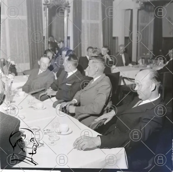 möte, 1940-tal, svartvitt, män, bord, kaffe, samtal, kläder, inredning, restaurang, glas, stolar, blommor, spegel, diskussion, formell, samling, historisk, interiör, socialt, event, stil, tradition, elegans, affärsmän, uttryck, ansikten, atmosfär, tidsepok