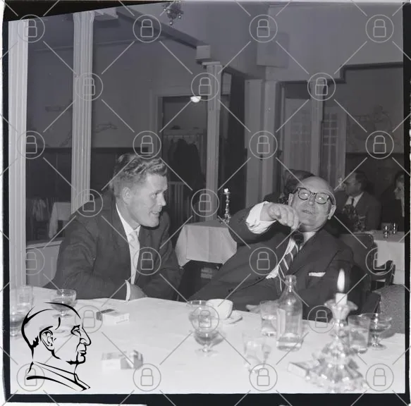 män, samtal, bar, glas, cigaretter, bord, 1950-tal, kläder, inomhus, möbler, ljus, fest, socialt, skratt, vänner, alkohol, dekoration, svartvitt, retro, stil, uttryck, interiör, samvaro, tradition, elegans, nöje, sällskap, minnen, historia