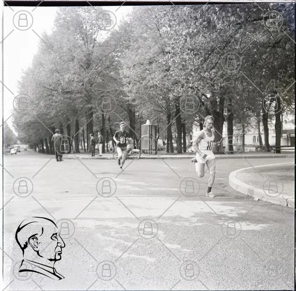 löpning, tävling, sport, män, nummer 10, nummer 71, träd, park, asfalt, cykel, 1950-tal, svartvitt, motion, utomhus, jogging, hastighet, idrott, kläder, nummertröjor, fotbollsskor, stadslandskap, människor, aktivitet, natur, gator, väg, cyklist, löpare, tävlingsanda, ungdomar