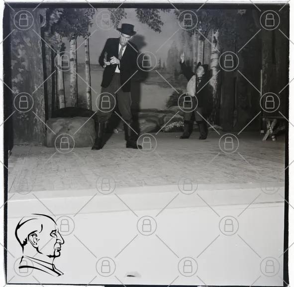 teater, scen, skådespelare, kostymer, skog, björkar, landskap, föreställning, hatt, stövlar, svartvit, rekvisita, bakgrund, dramatik, uppträdande