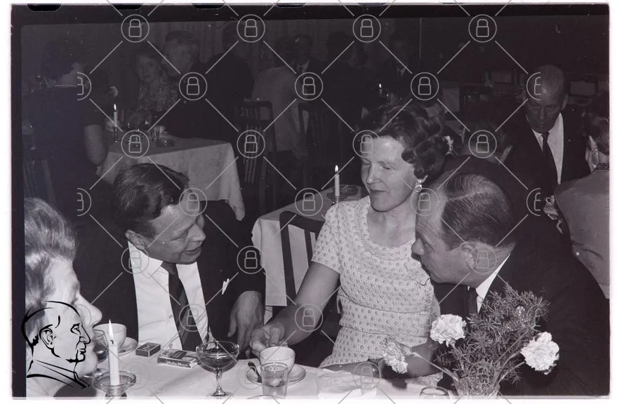middag, fest, 1950-tal, svartvitt, klänning, kostym, glas, skratt, sällskap, bord, ljus, socialt, eleganta, samtal, människor, retro, inredning, restaurang, nöje, vänskap, tradition, stil, vintage, samvaro, festligheter, minnen, glädje, gemenskap