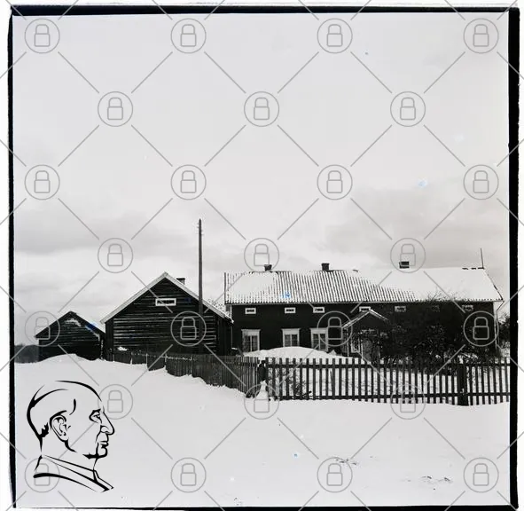 vinter, snö, hus, staket, träd, moln, himmel, byggnad, landskap, svartvitt, gammaldags, traditionell, gård, tak, fönster, dörr, skog, lantligt, Sverige, skugga