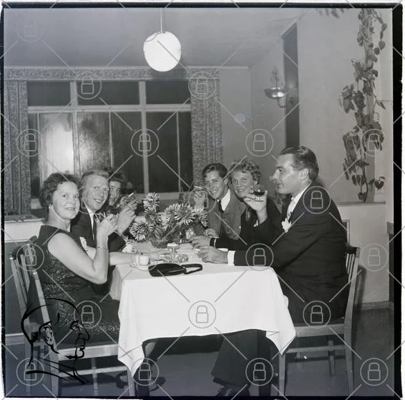 fest, middag, sällskap, glas, leenden, klänning, kostym, bord, blommor, inredning, 1950-tal, vänner, firande, fotografi, svartvitt, socialt, skratt, stämning, gemenskap, dekoration
