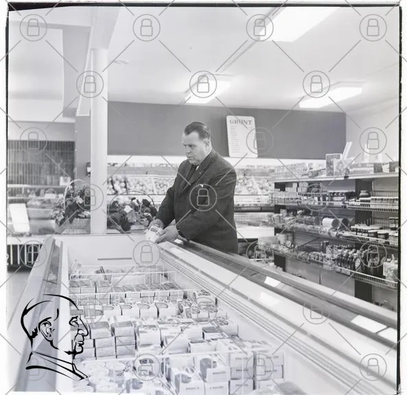 man, affär, frys, livsmedel, butik, varor, shopping, 1950-tal, kläder, hyllor, produkter, frysta, mat, kund, detaljhandel, inredning, belysning, kassa, konsumtion, handel, livsmedelsbutik