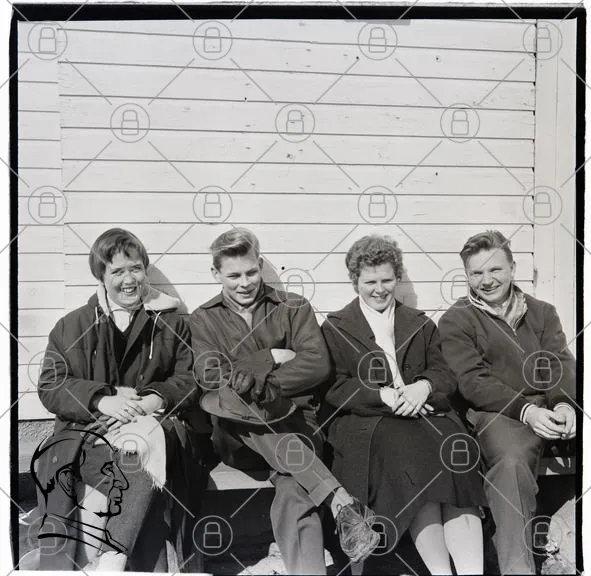 gruppfoto, fyra personer, sittande, leende, jackor, utomhus, trävägg, svartvitt, ungdomar, vänner, soligt, avslappnat, retro, 1950-tal, mode, frisyrer, skuggor, kläder, skor, handskar, bänk