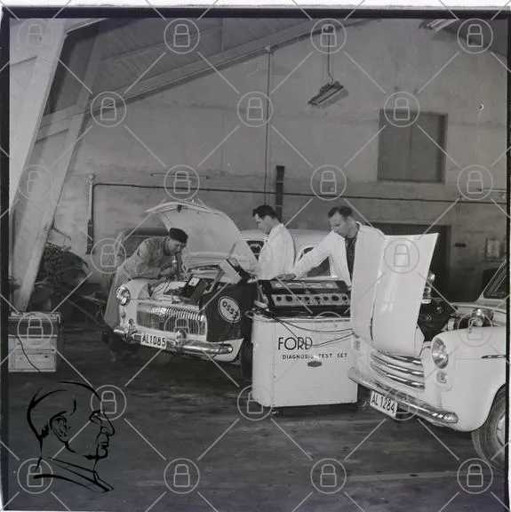 bilar, verkstad, mekaniker, 1950-tal, motor, reparation, diagnostik, Ford, testutrustning, garage, teknik, arbete, män, fordon, motorhuv, verktyg, maskiner, industri, gammal, svartvit, retro