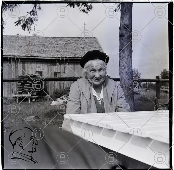 kvinna, äldre, leende, hatt, jacka, träd, staket, träbyggnad, utomhus, sommar, svartvit, porträtt, landsbygd, gård, bord, stol, gräs, vedstapel, himmel, moln