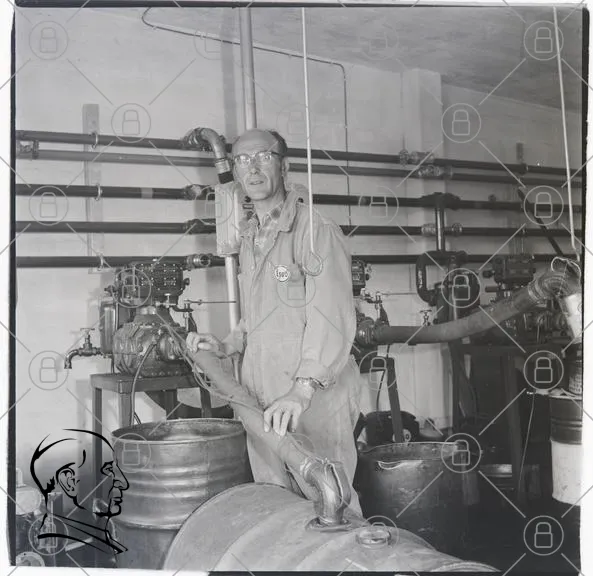 man, verkstad, maskiner, rör, fat, glasögon, arbetskläder, industri, teknik, 1900-tal, utrustning, arbete, metall, fabrik, mekanik, manuell, process, produktion, hantverk, miljö, svartvitt, retro, historisk, professionell, verktyg, installation, system, rörledning, industriell, arbetsmiljö