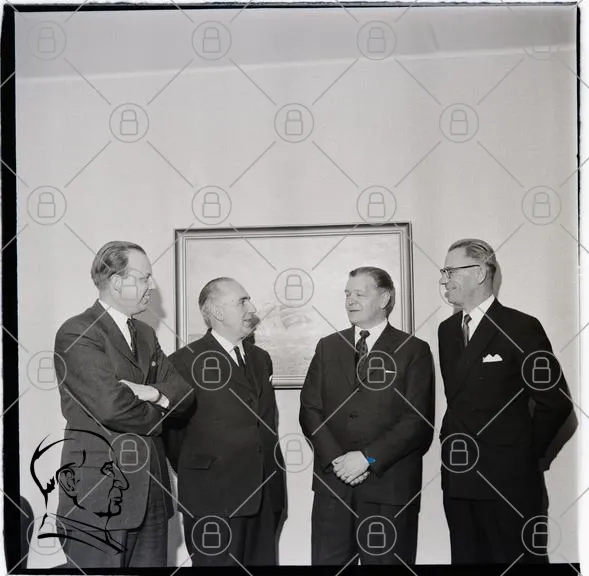 män, kostymer, möte, affärsmän, svartvitt, 1960-tal, diskussion, inomhus, porträtt, professionellt, kläder, leenden, väggkonst, kontor, samarbete, formell, stil, ansikten, grupp, interaktion