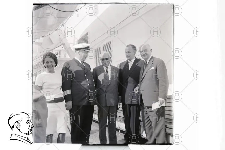 svartvit, grupp, människor, båt, skepp, kapten, kostymer, klänning, leende, porträtt, 1960-tal, stil, marin, resande, vänskap, samarbete, elegans, tradition, historia, segling, hav, nöje, socialt, evenemang, fotografi, minnen, fest, lyx, gemenskap, avsked