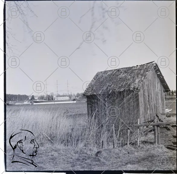 stuga, trä, tak, gräs, vatten, båt, segelbåt, landskap, svartvitt, natur, horisont, träd, gammal, byggnad, sjö, stillhet, sommar, skärgård, svensk, kust, vy, fotokonst, traditionell, rustik, landsbygden, himmel, reflektion, lugn, historia